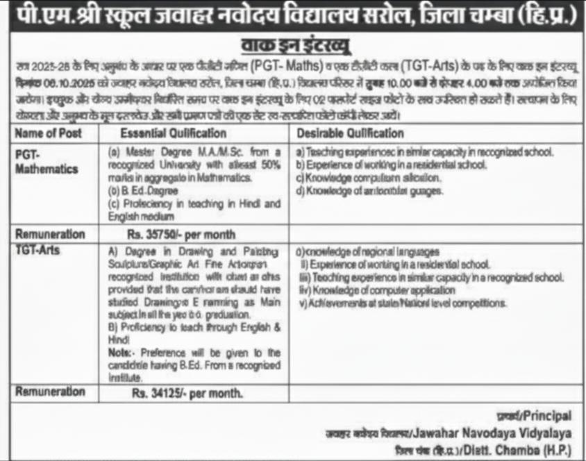 चम्बा हिमाचल प्रदेश के जवाहर नवोदय विद्यालय में संविदा शिक्षक और प्रशिक्षक पदों के लिए इच्छुक अभ्यर्थियों से आवेदन आमंत्रित किए गए हैं। विद्यालय प्रशासन द्वारा जारी सूचना के अनुसार, चयन प्रक्रिया साक्षात्कार के माध्यम से की जाएगी। इच्छुक उम्मीदवारों को 8 अक्टूबर को विद्यालय परिसर में आयोजित इंटरव्यू में शामिल होना होगा।